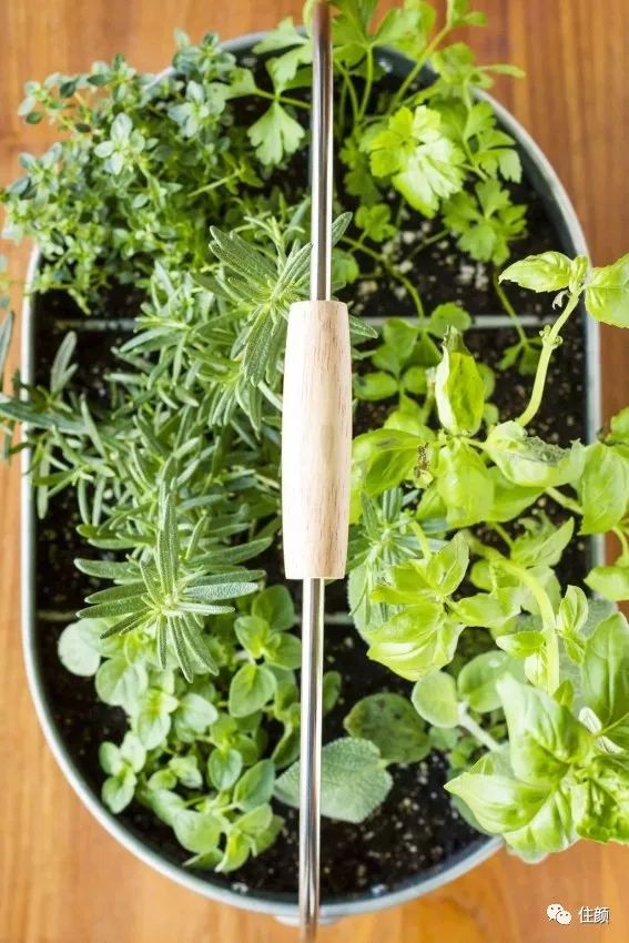 ②香草:罗勒、迷迭香、西洋香葱、百里香等绿叶香草,也很适合在这样的容器中种植。