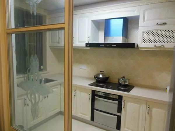 推拉门半开状态,从门口望过去。浅粉色的石英石台板,象牙白的樱桃木门。