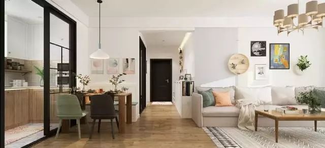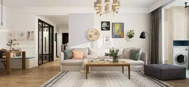 客厅很大,就设计了一个长型沙发墙设计,简约的挂画做装饰,阳台在客厅外,可以放洗衣机,顺便晒衣服。