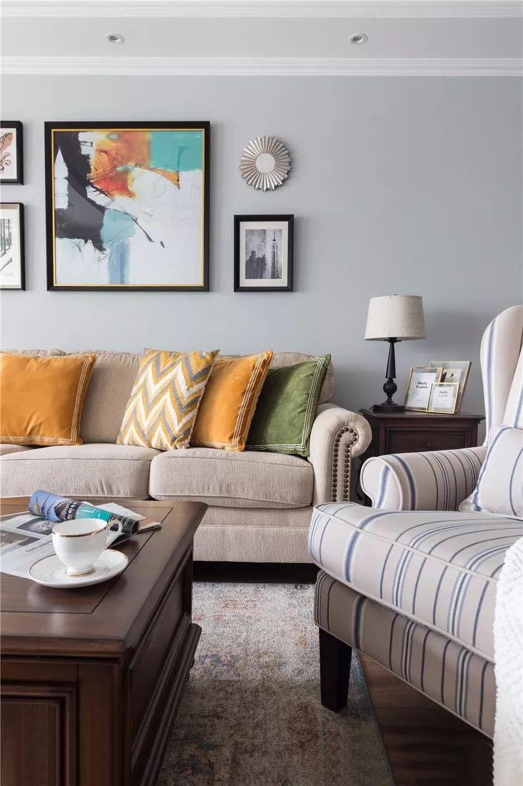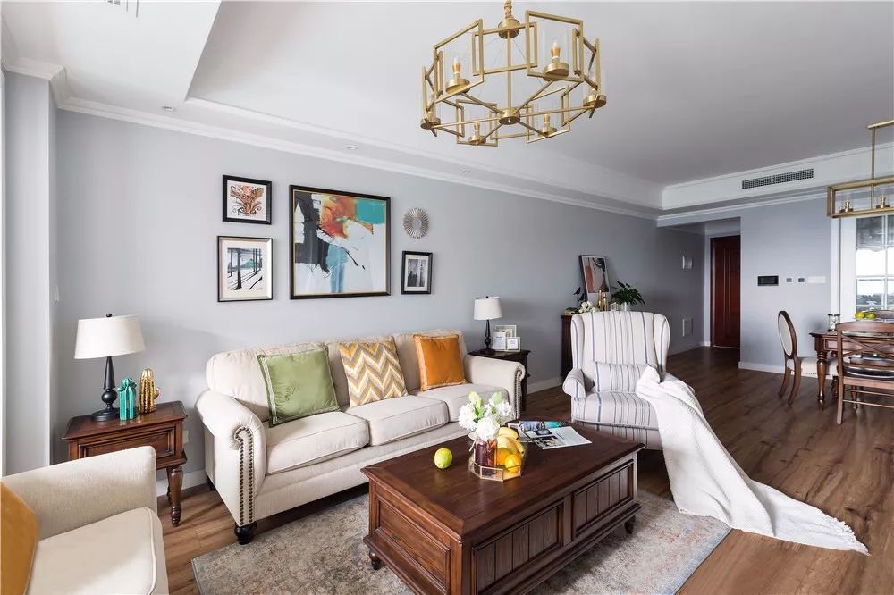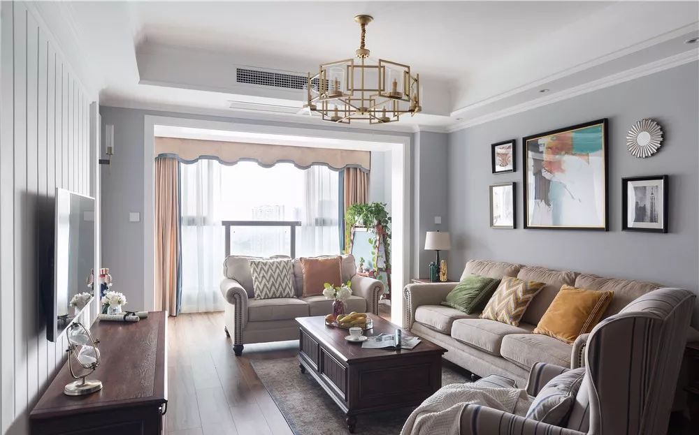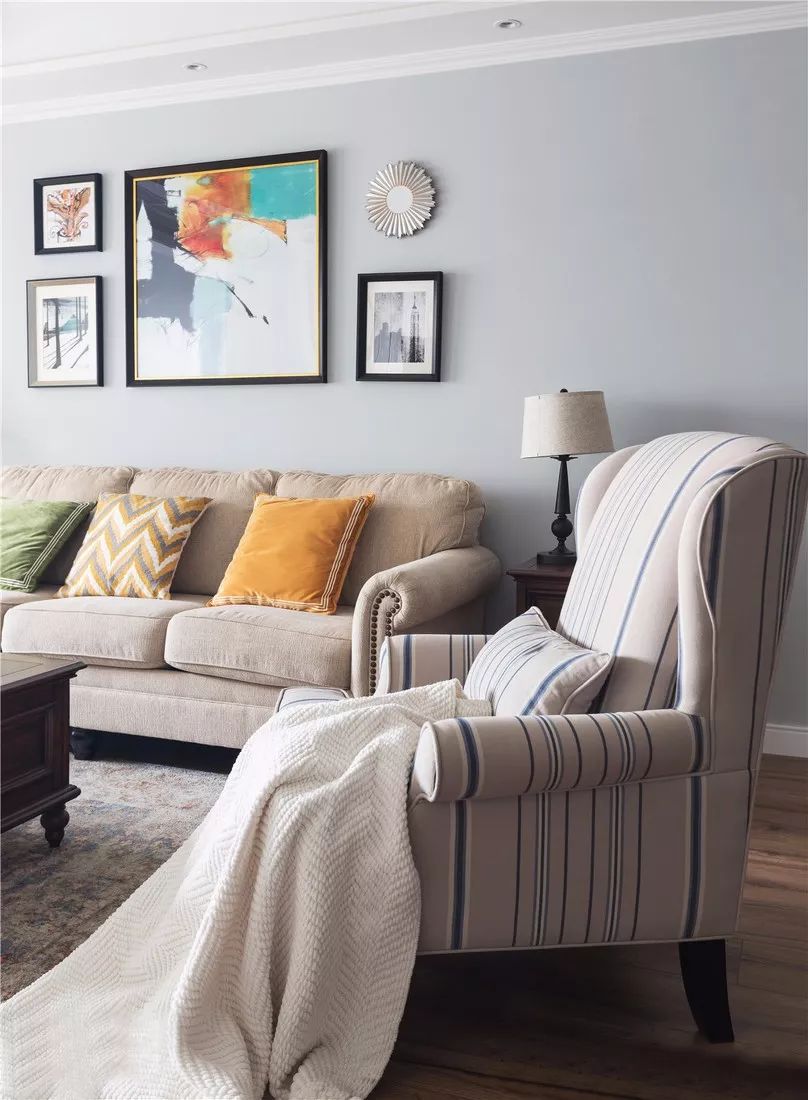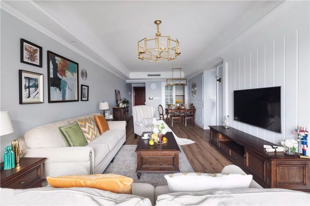 更多装修案例、家居经验欢迎关注微信公众号:jia-ms (美式装修案例精选)美式风格设计遵循简洁、硬朗、淡雅的主基调,用高雅沉稳的家具搭配轻奢金属系装饰,渲染出浓浓的艺术气息,使整个空间眼前一亮。面积:138㎡户型:三居风格:美式▲ 客厅风格简洁明快,电视墙采用石膏板留水缝,拉伸空间的纵深感。两