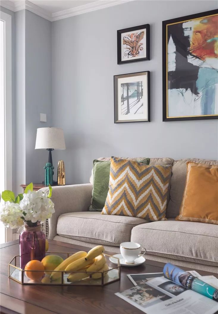 ▲沙发背景墙采用与空间主调同色系的挂画与镜饰来点缀,使整个空间灵动起来。