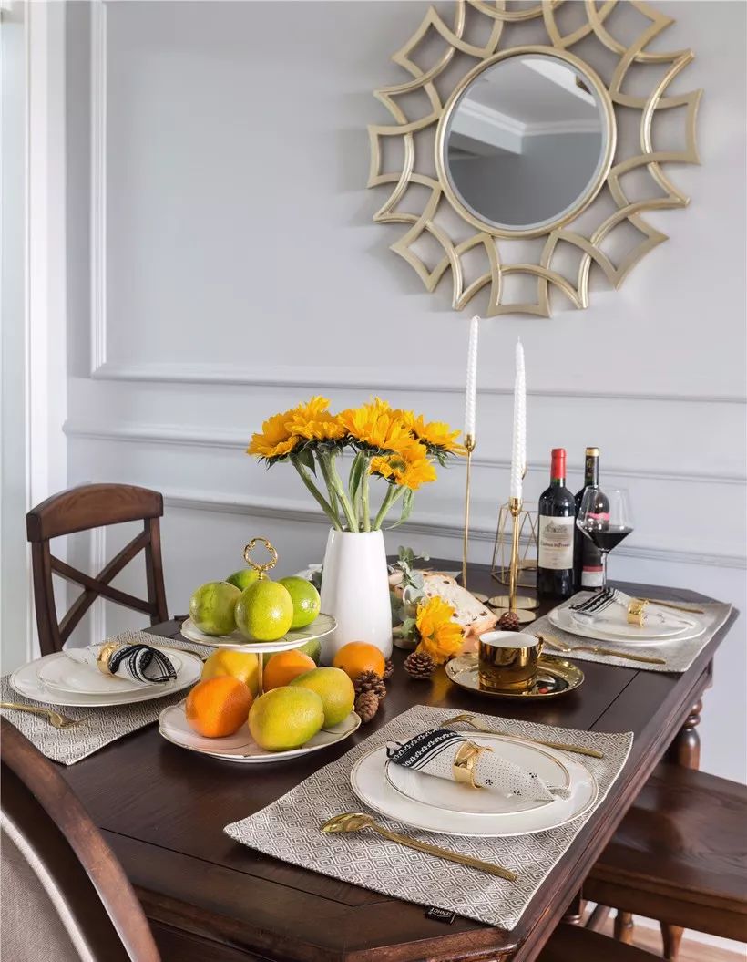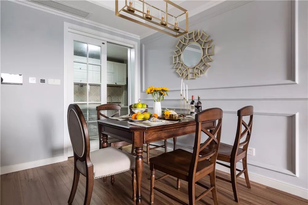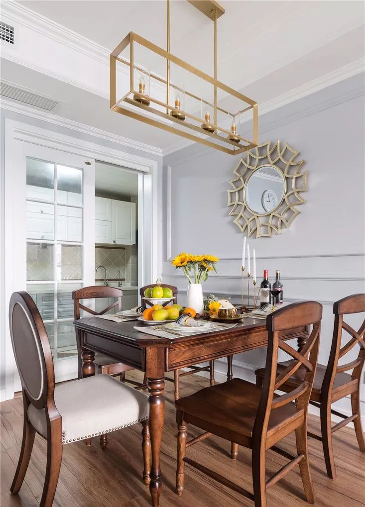 ▲餐厅墙面运用线条造型打造空间层次感,金色复古壁镜装饰,将美式的华丽从细节处显露出,打造空间的精致感。