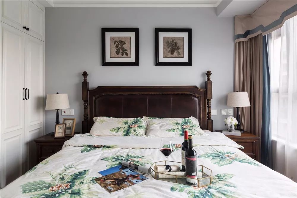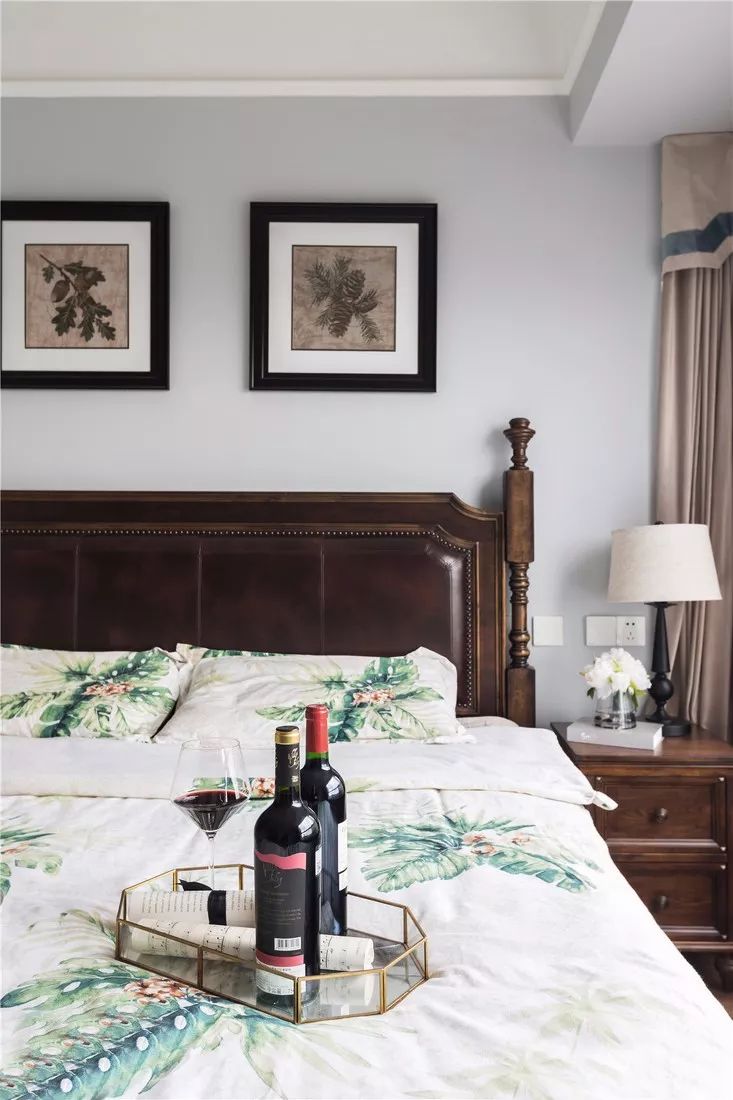 ▲皮质床头质感高级而又舒适,也不会在视觉上显得过于松散,契合美式风格的优雅。床头背景墙以两幅深色系挂画为装饰,与整个房间色调一致。