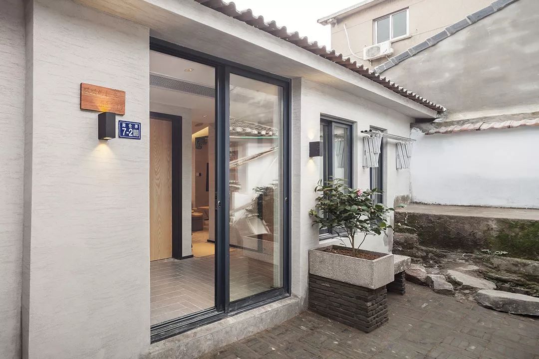 改造后设计师拆除了原有的石板路改用青石重新铺设了路面,房门改用玻璃拉门,在里侧又加开了一扇窗户,极大的提升了房屋的采光的同时外观也十分的简洁大气。在卫生间的窗户旁设置了拉伸折叠式的晾衣架,方便户主晾晒衣物。暖心的设计师还将废弃的水池种上花草加以点缀。