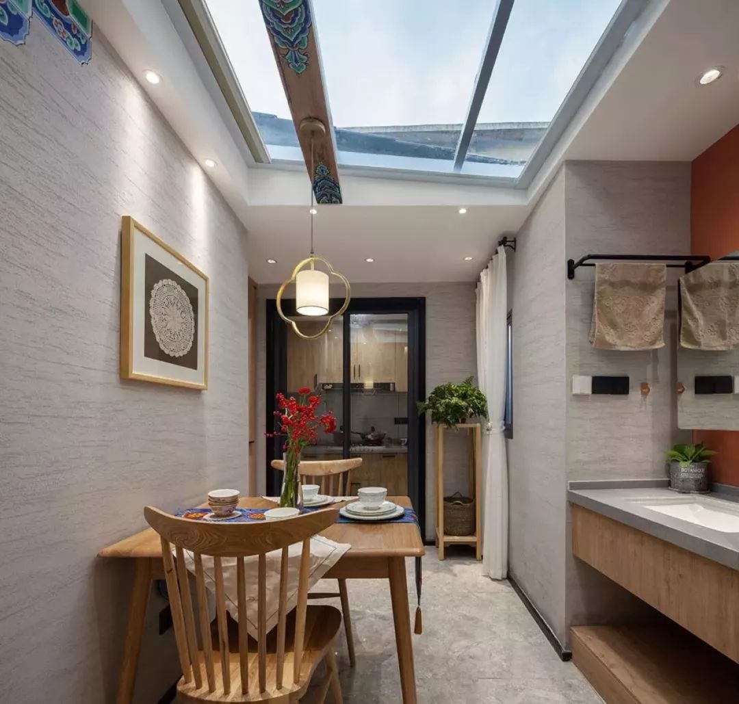 餐厅正上方保留了原有的房梁加以苏式彩绘点缀,开设了超大全景天窗将自然光源引入室内增加采光。折叠餐桌方便两人平时使用,有客人来时打开餐桌也方便用餐。餐桌对面加设的洗漱池更加方便了老两口日常的生活起居。