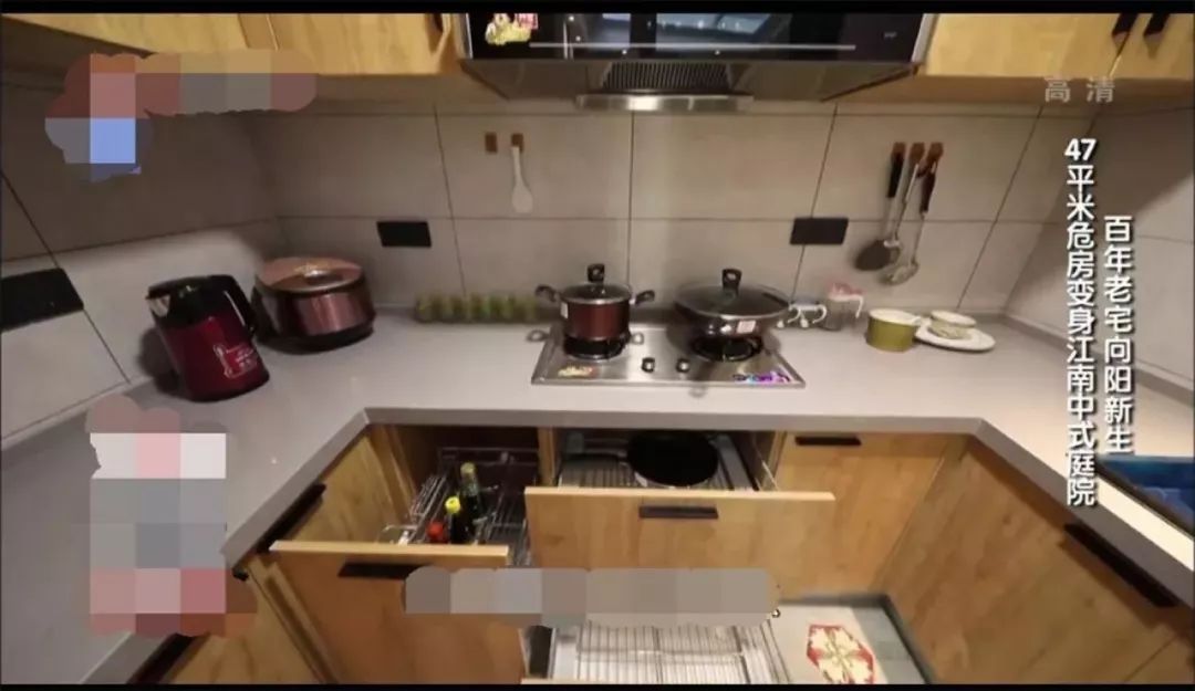 改造后设计师将厨房操作台的高度明显降低且加入了专业的厨房收纳系统,推拉式拉篮的运用方便女主人的日常生活。