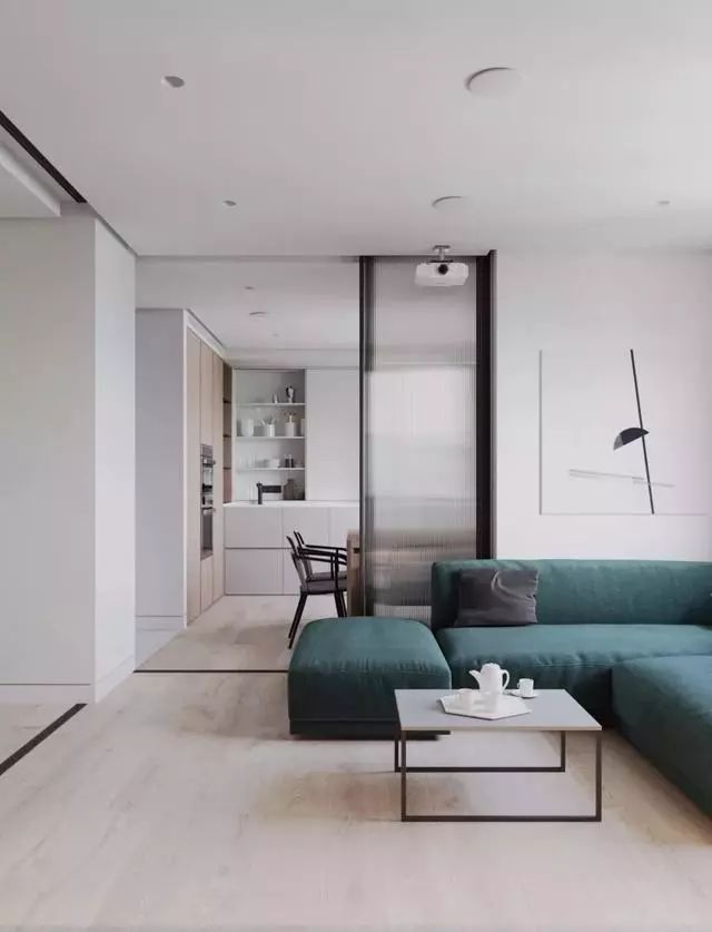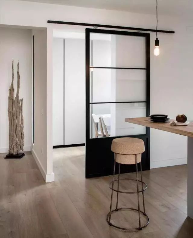 大家喜欢吊轨门的设计吗?如果不想安装原始的平开门,就可以直接安装这种不占地方的吊轨门。吊轨门密封性也不错,关得严实,不怕油烟会跑到客厅里面。
