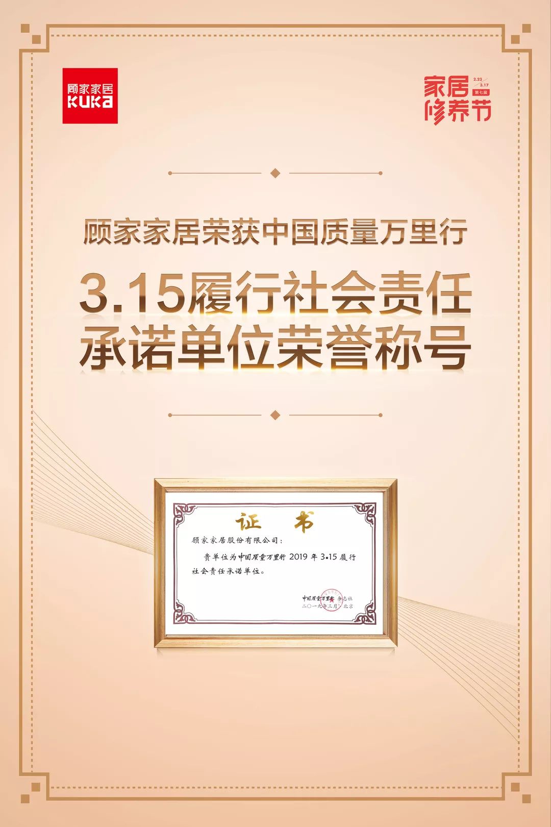 顾家家居荣获中国质量万里行315履行社会责任承诺单位荣誉称号&中国质检报刊社中国质量品牌称号;品质保障,以客为尊,奋力前行。