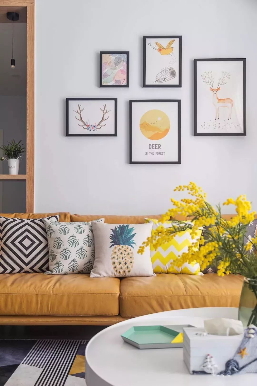 沙发墙上规则悬挂五幅装饰画,装饰画的图案与沙发上的抱枕互为呼应,治愈感爆棚。