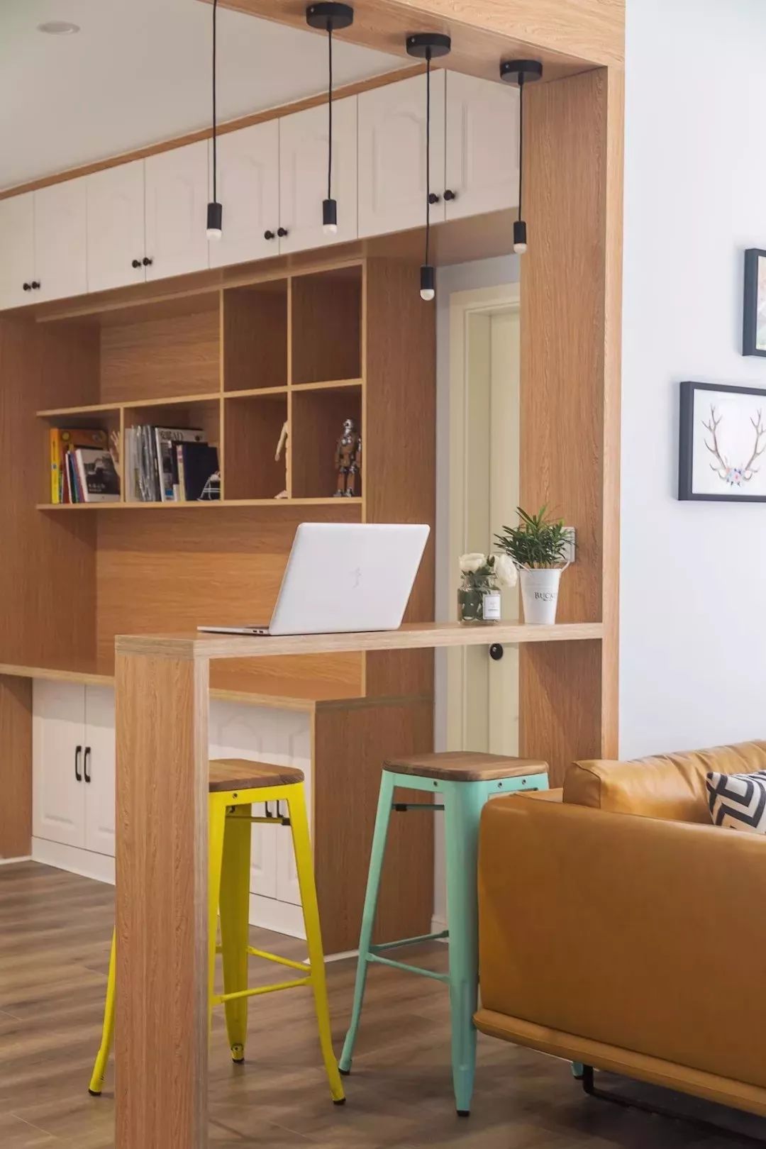 将原儿童房改造成多功能活动区域,用吧台设计作分割。另外,吧台还可以作为临时工作区来用。