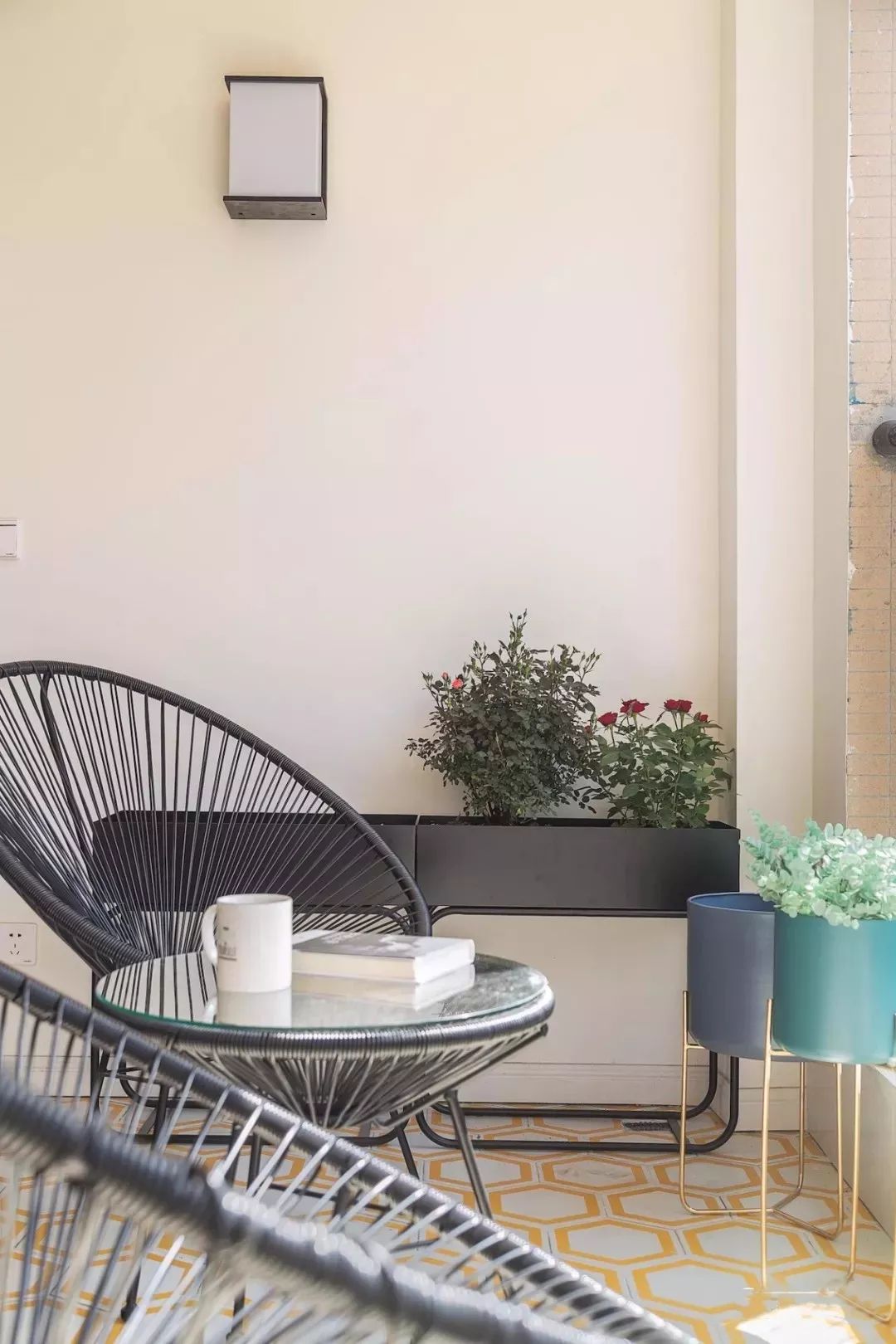 与客厅相连的阳台布置成了休闲区。亮色六边形花砖搭配铁架盆栽,外加一套室外休闲桌椅,整体给人舒适小清新的感觉。