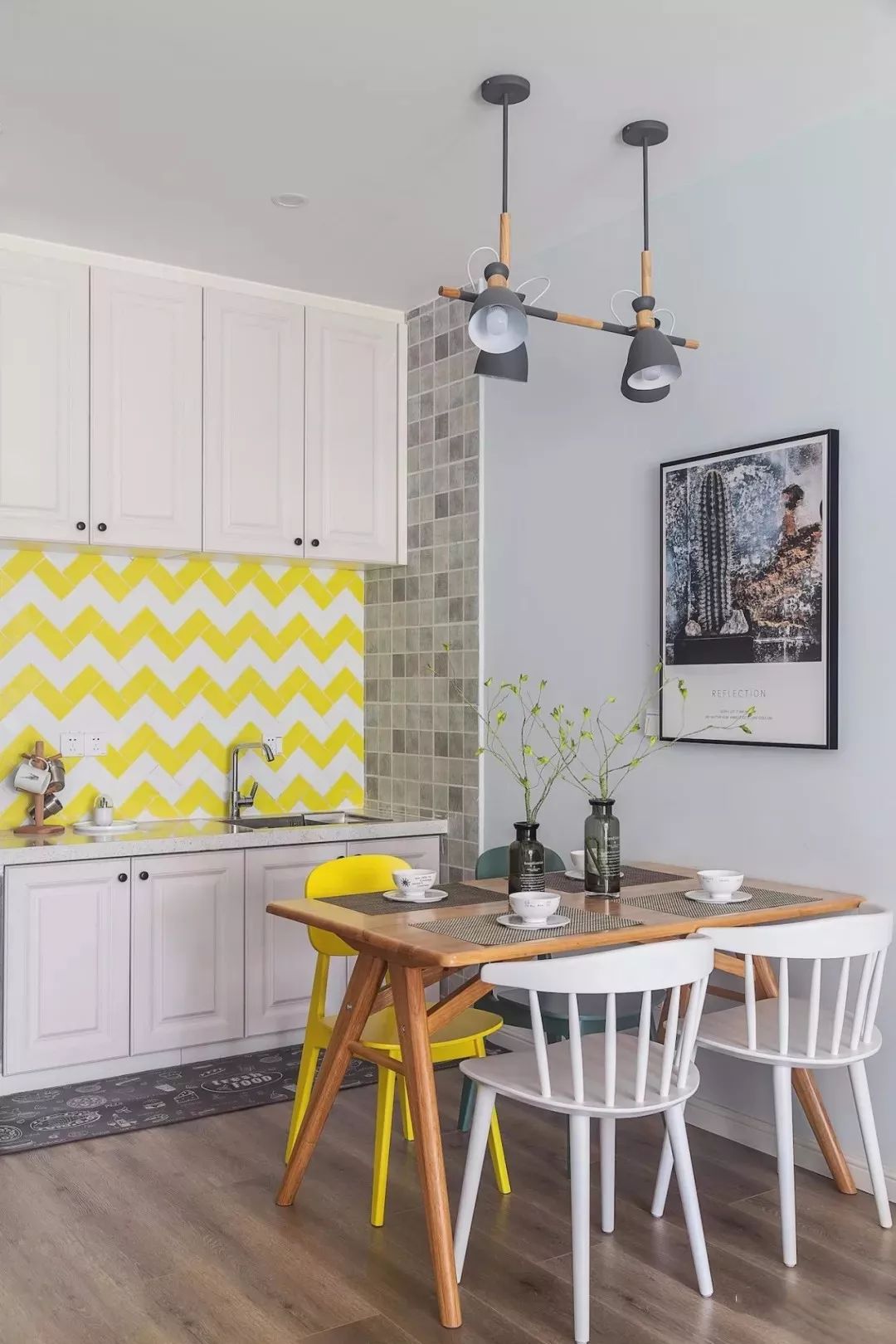 餐厅与客厅互通,保证餐厅采光。餐厅的整体风格延续公领域的格调,餐边增设西厨,亮黄色瓷砖拼贴出动感背景。