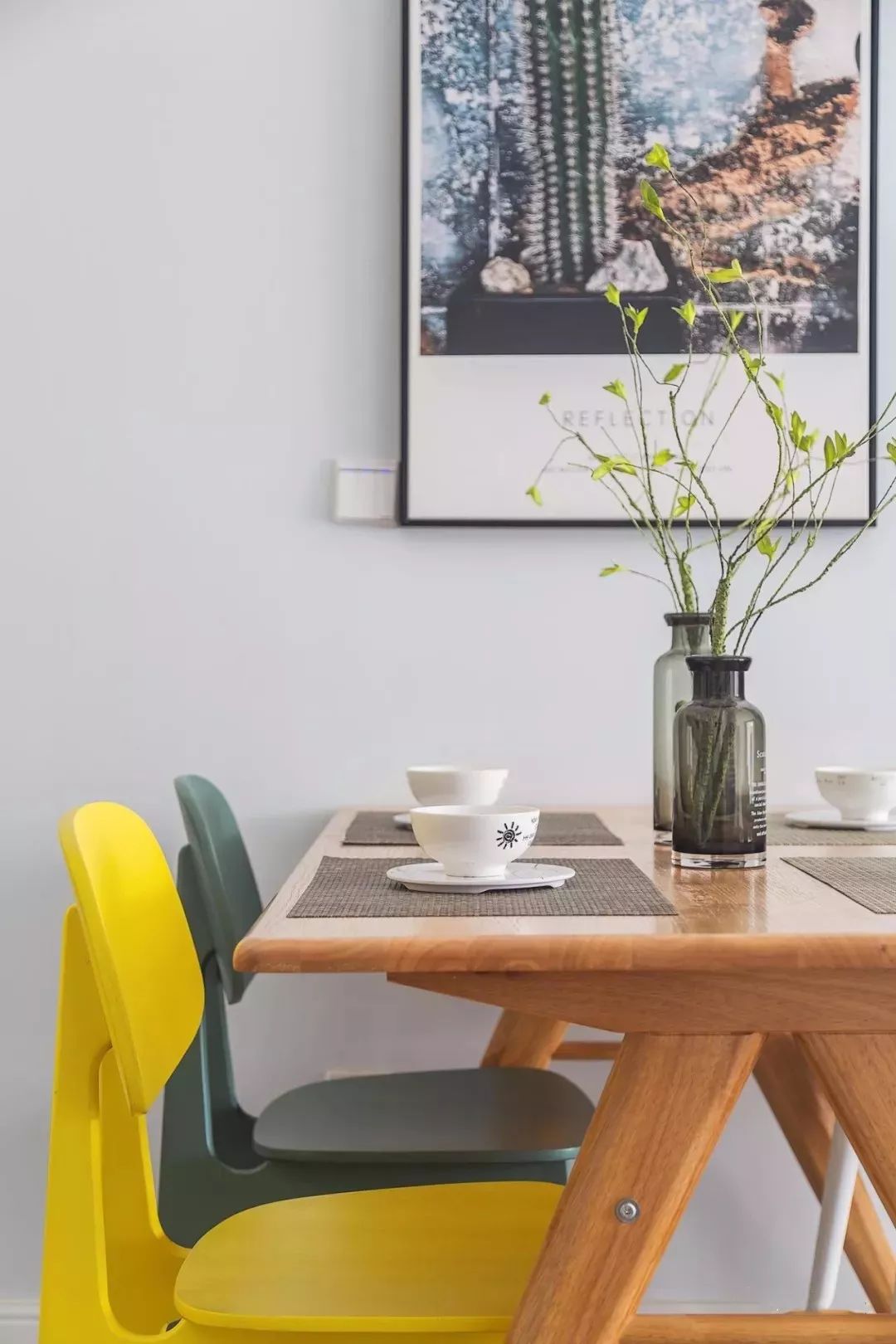 简单的木质餐桌搭配撞色餐椅,呈现无限自然生机。