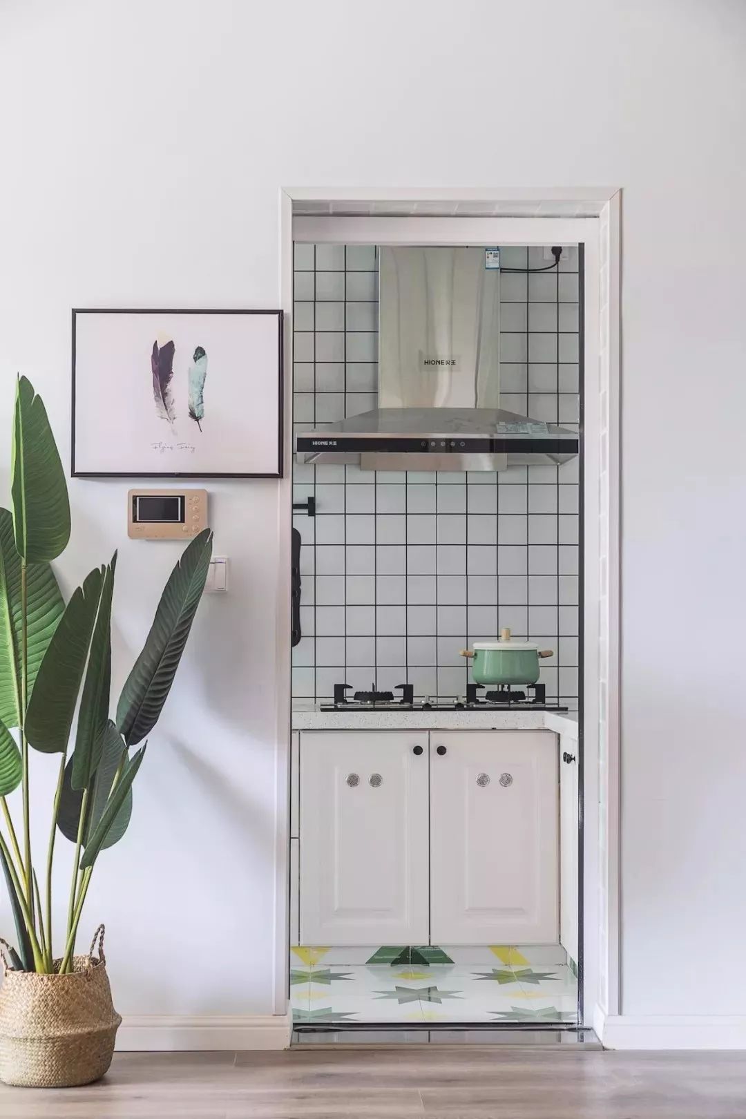 厨房走的是小清新路线,门口放有文艺范十足的绿植和挂画。