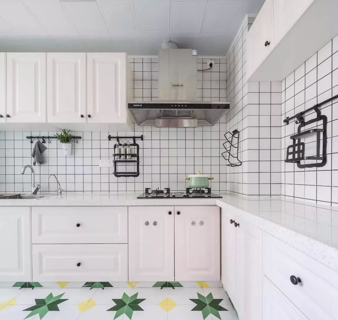厨房花砖地面,搭配墙面白色方砖与黑色美缝,打造北欧料理空间。