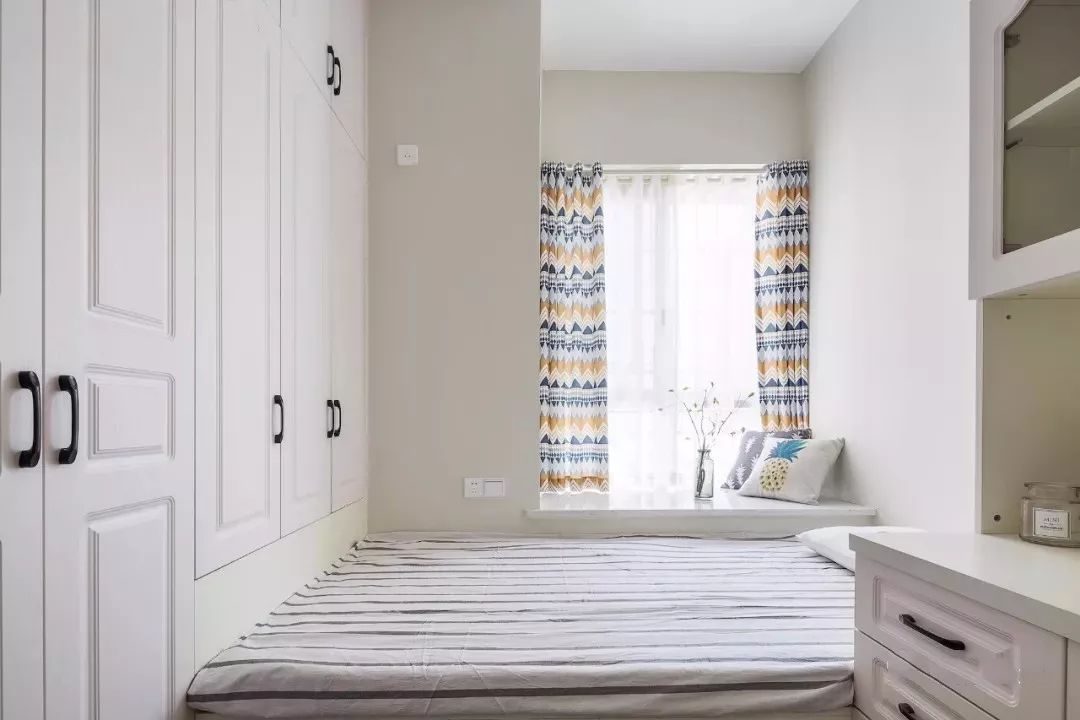 次卧安装了榻榻米床铺与大面积收纳柜,榻榻米靠着休闲飘窗放,房间虽小,但可利用的面积一点不少。