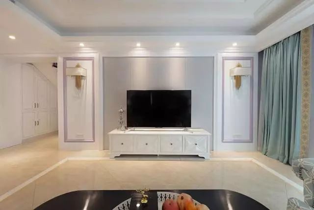 电视背景墙同样也是做了对称的造型,浅灰色硬包居中,两侧的紫色石膏线造型和壁灯,顶部跌级吊顶加上筒灯,简洁又浪漫。