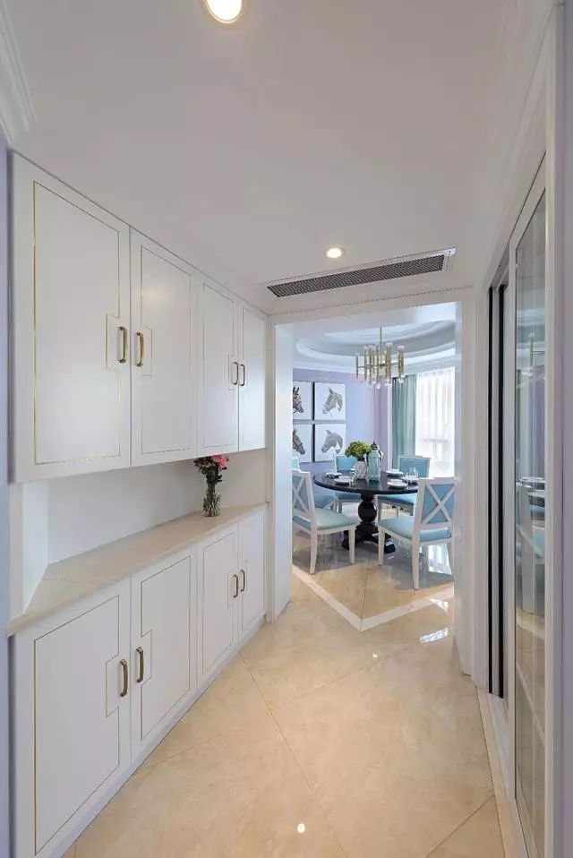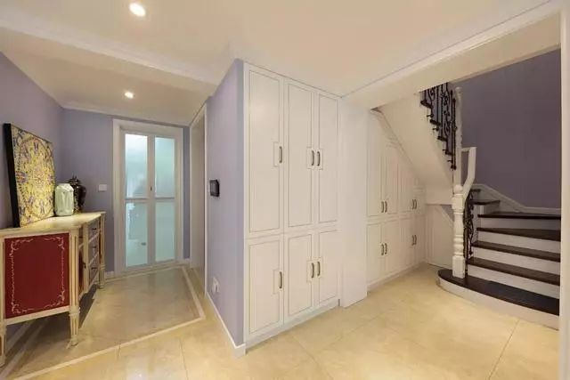 客厅通往餐厅和厨房的走廊,做了嵌入式的柜子,紫色的墙面和白色的柜子和金属线条结合起来,让人感觉非常的优雅、大气。