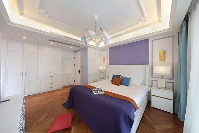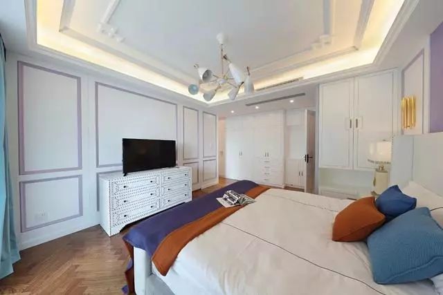 跌级吊顶,人字拼的地板,床尾电视墙是简约大方的紫色石膏造型,配合满眼的白柜收纳,显得特别的自然和谐。