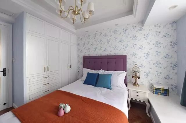 次卧的床头背景墙铺贴了碎花壁纸,侧面同样是嵌入式的到顶柜子,整个家的背景墙、柜子都选择了相似的造型,能够让家里变得更有整体感。