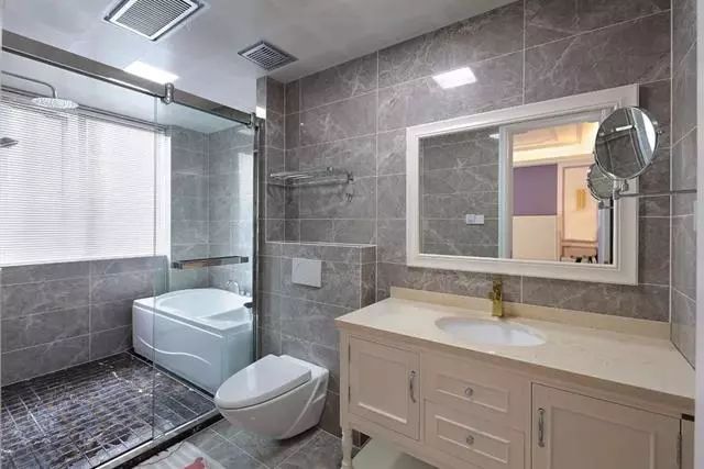 卫生间通铺浅灰色的大理石瓷砖,搭配象牙白的浴室柜,淋浴区内部还有一个迷你小浴缸,可以方便屋主偶尔泡个澡。