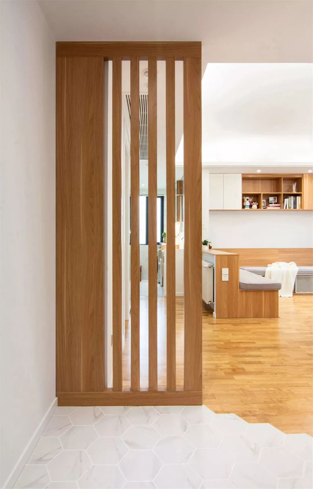 入户的玄关走廊对着卫生间,所以设计师加上了一个木栅栏隔断来进行遮掩。玄关的地面铺贴六边砖,和木地板拼接起来非常好看。