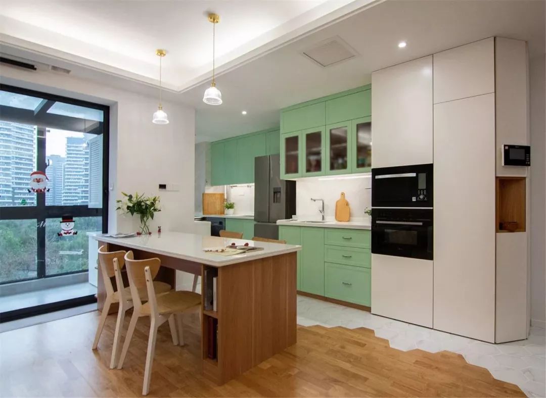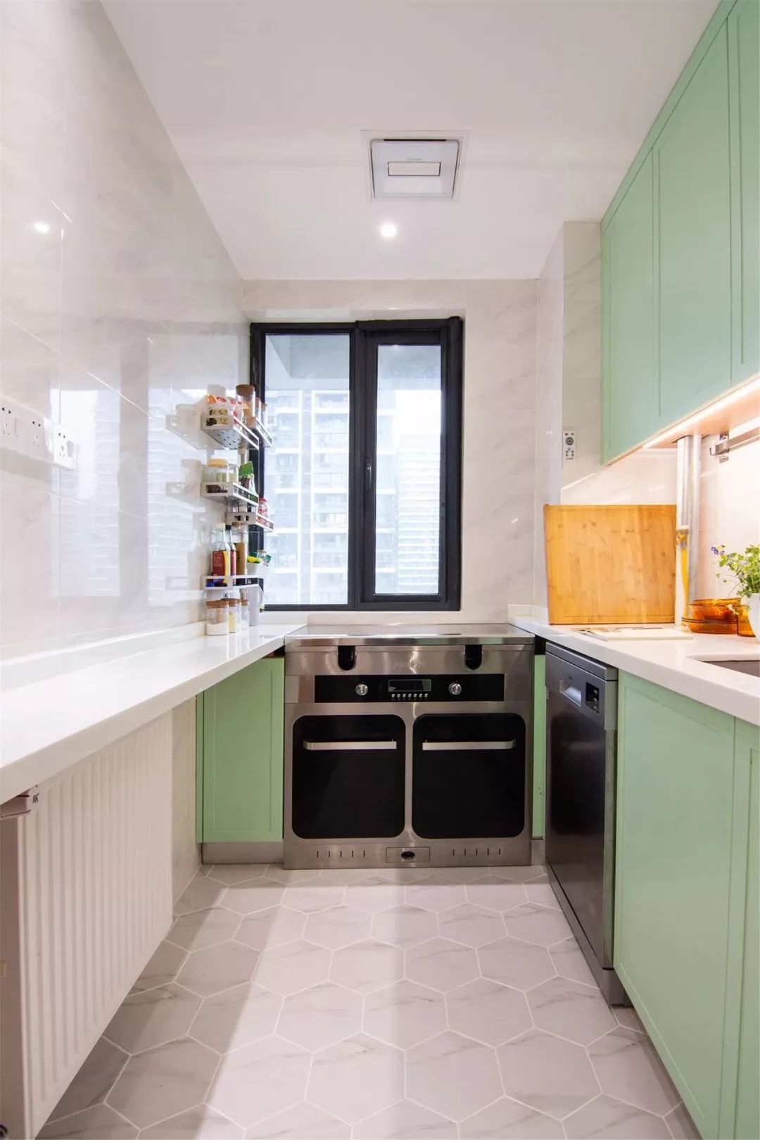 厨房内部的空间还是比较宽敞的,L型的橱柜布局,淡青色的橱柜搭配灰色调六边砖和白色的墙砖,构造出一个清新文艺的烹饪空间。