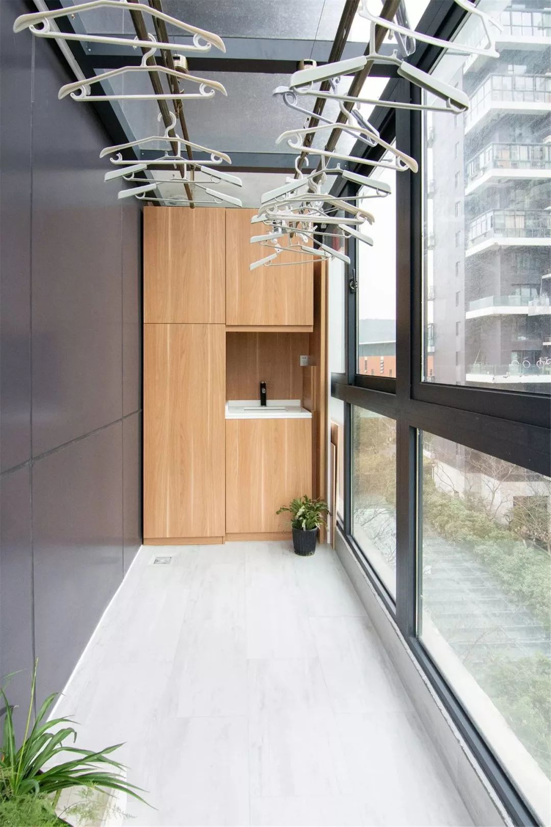 阳台是一个L型的空间,全包黑框玻璃的设计让阳台的光线变得更加充足。在阳台的角落里也做了储物柜,方便平时摆放一些零碎杂物和晾晒的衣架等。