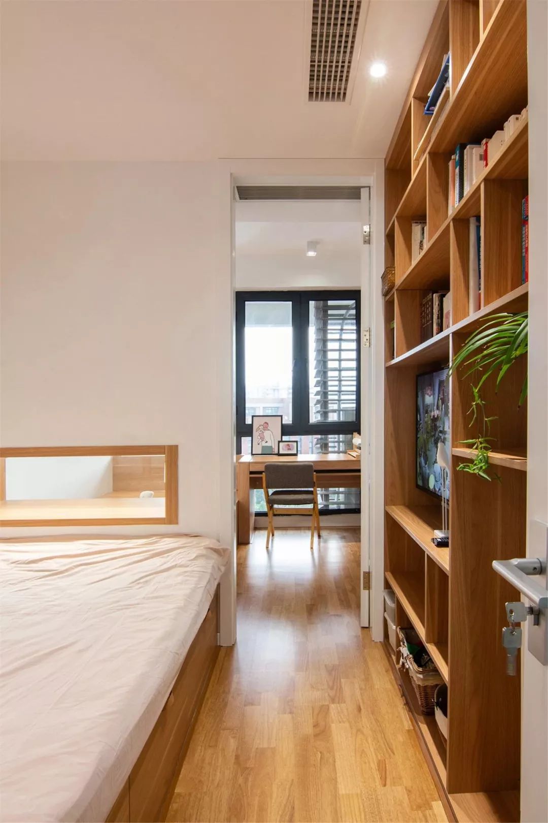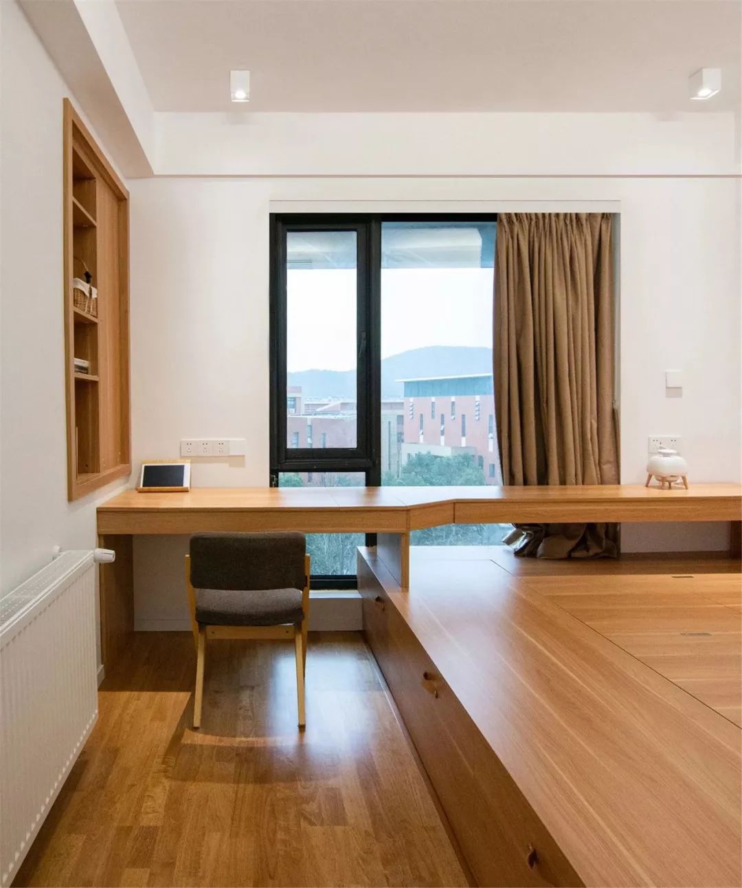 主卧室被设计成了榻榻米床组合书桌柜的设计,在床尾抬高一部分的地方做书桌面,增强了可操作空间,也方便日常使用。