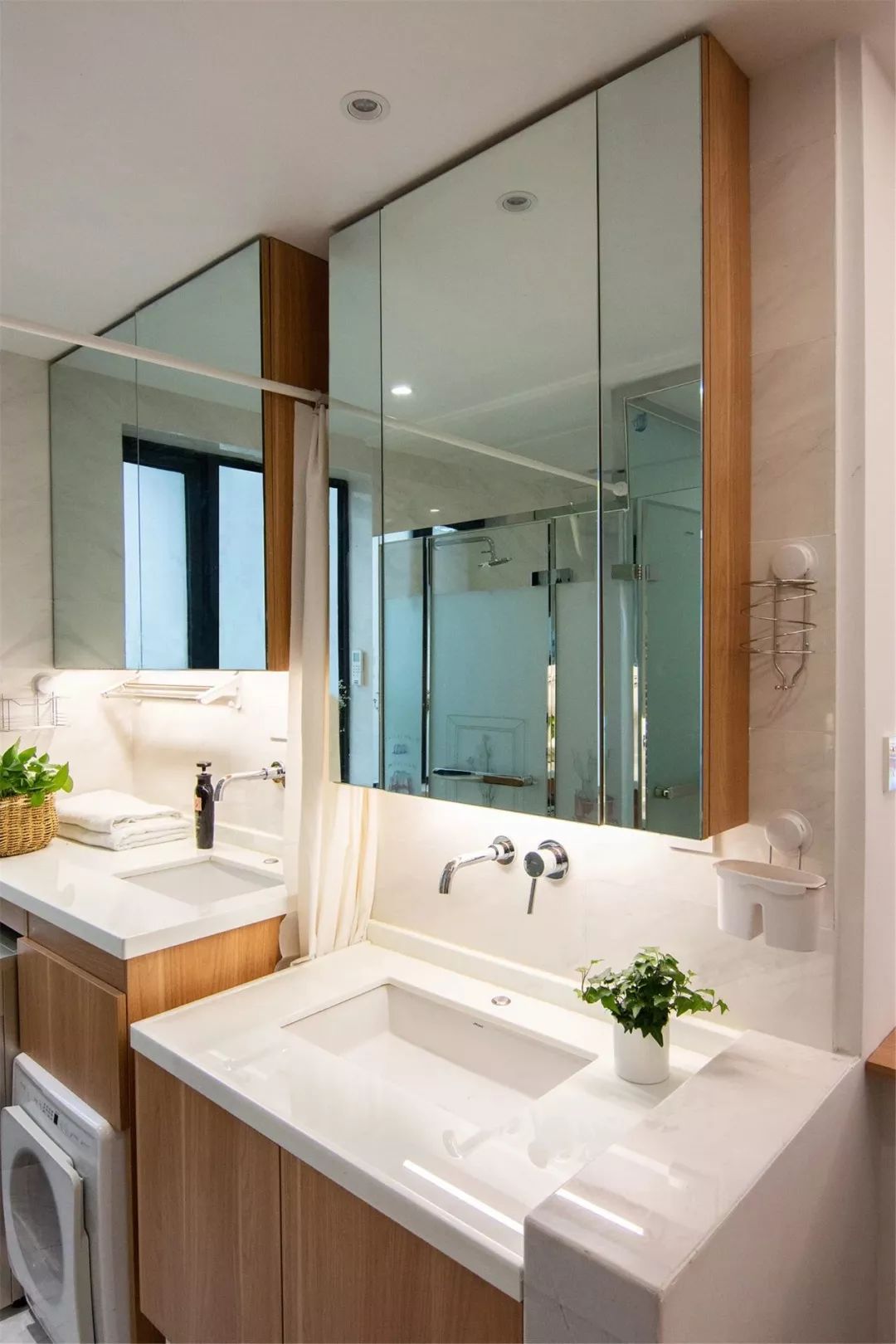 卫生间处做了双洗手台的设计,方便日常的使用,两者之间还加上了浴帘作为隔断,洗衣机也被嵌入在了洗手台下方,更为节约空间。