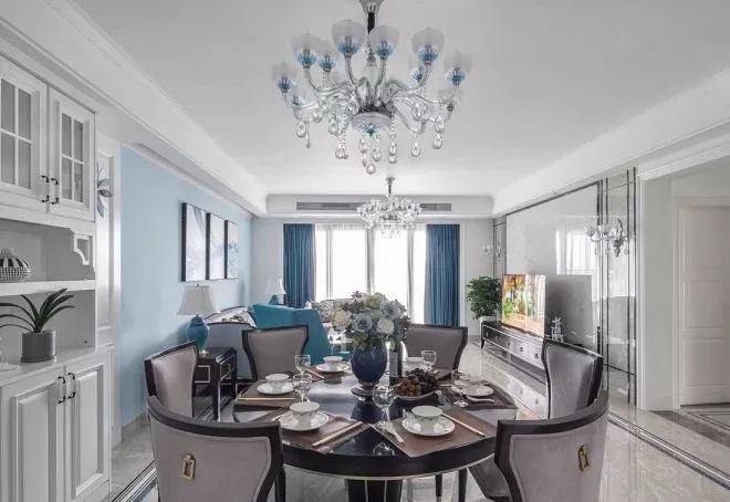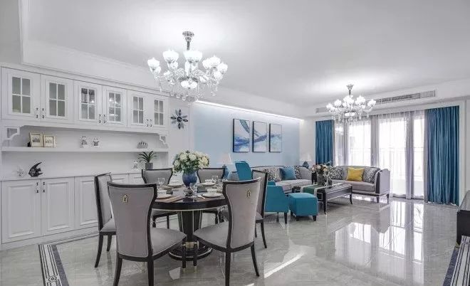 客厅与餐厅没有做任何隔断,共享空间;整体装修以浅色为主,深色作为点缀,本来就宽敞的客厅显得越发大。