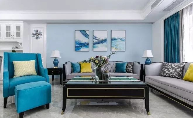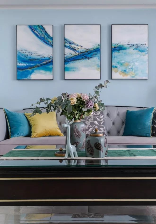 客厅整体装得十分简单,浅蓝墙面强调一下,装饰画风格一致;沙发选用相似或相近颜色的纯色。
