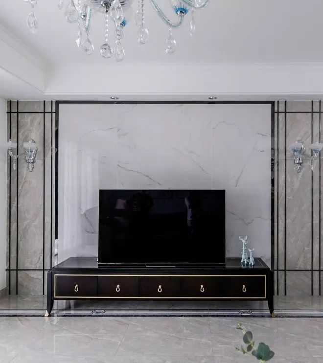 客厅,电视背景墙采用的是大理石,光泽度很高,整洁易打理。