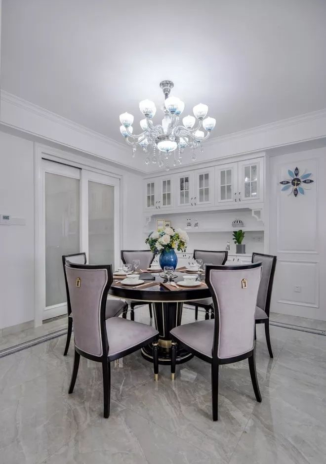 餐厅,一张复古圆桌,能最大限度上容纳多人用餐;线条柔和,对空间也不会造成什么影响。