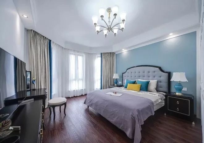 主卧,将阳台封起来包进卧室,改成落地窗形式;客厅也因此宽敞了不少,很气派。