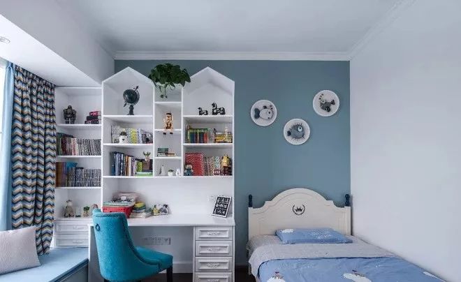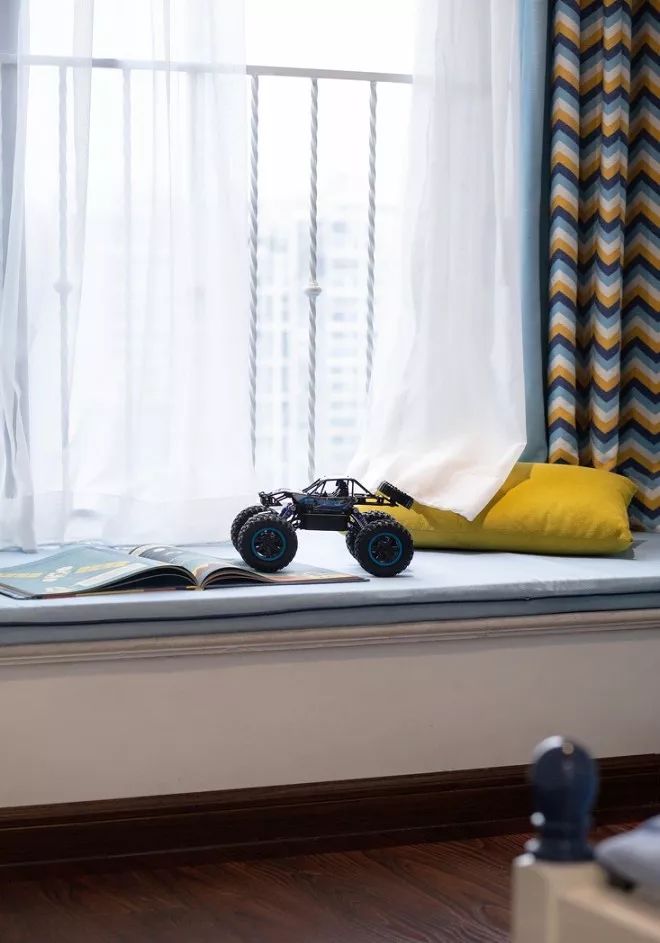 男孩房装修得十分紧凑,飘窗+收纳柜+床;面积虽不大,但功能十分齐全。
