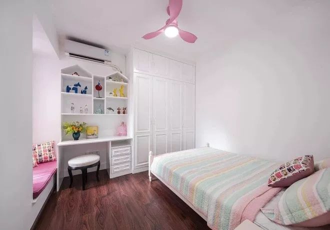 女儿房和男孩房是差不多的配置,墙面和天花板都没做过多的装饰;家纺上带点粉色就足够。