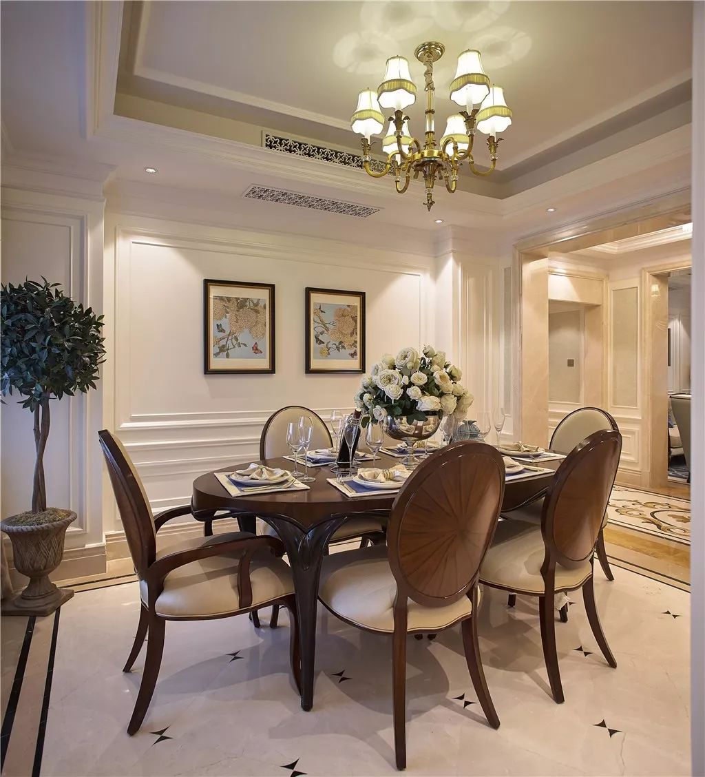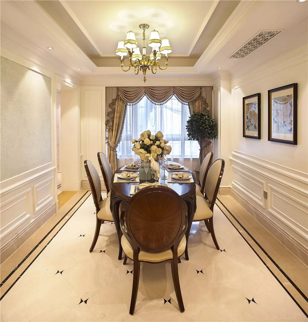 餐厅,一张古典6人椭圆形餐桌,米色墙面在灯光下很显温馨,插花布置点缀生机感;一个温馨浪漫的就餐空间。