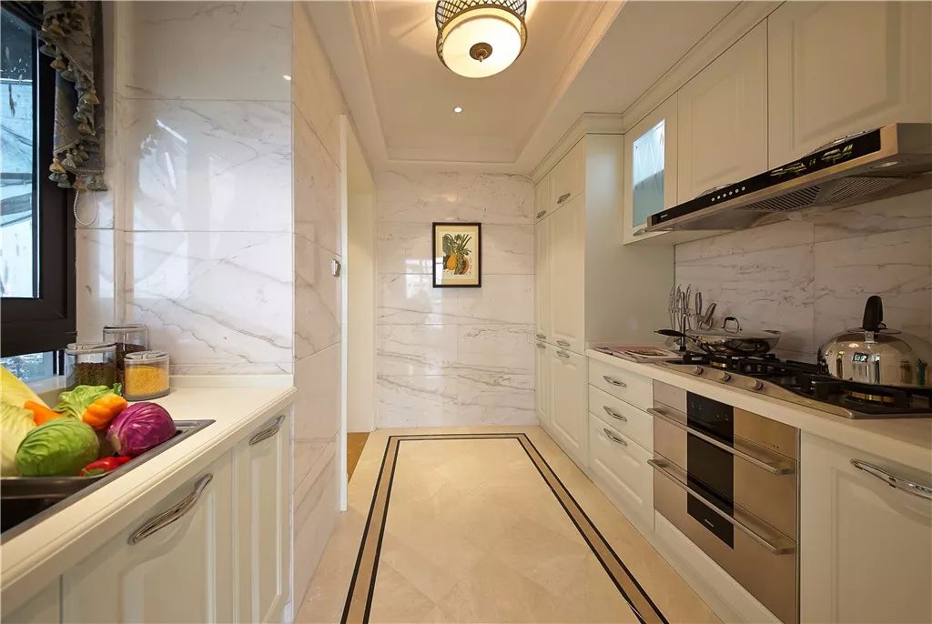 厨房,采用过道式厨房设计,尽头延伸大型置顶柜,是收纳一些大件厨房家电不错的选择。