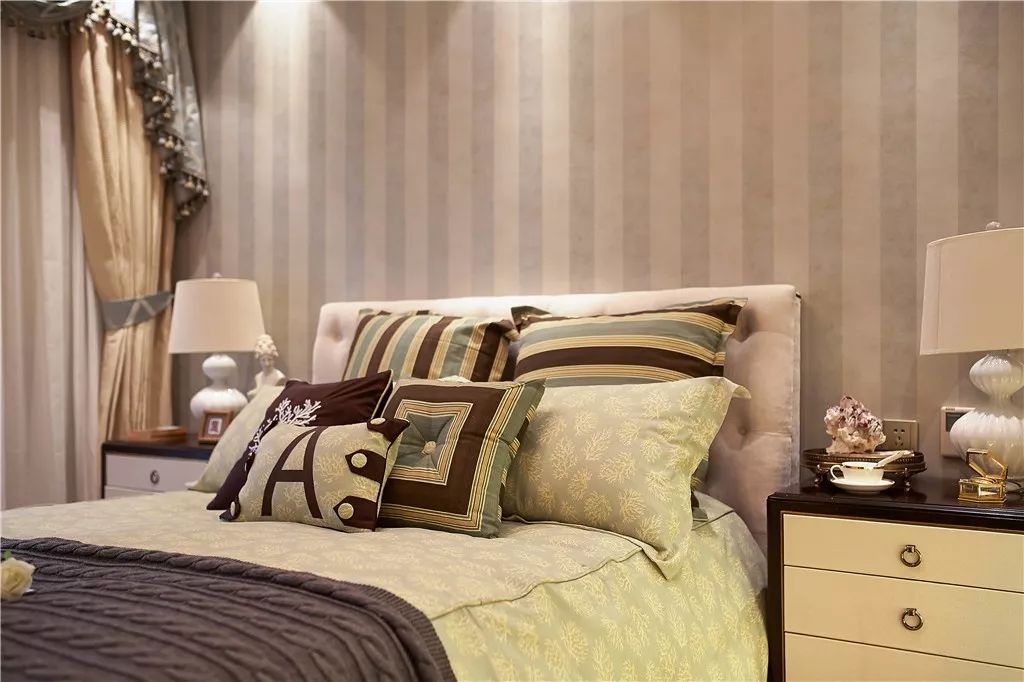 次卧,墙面采用竖条纹墙衣,温馨舒适的布置,还拉高视觉效果;蛋绿色床品清新可人。