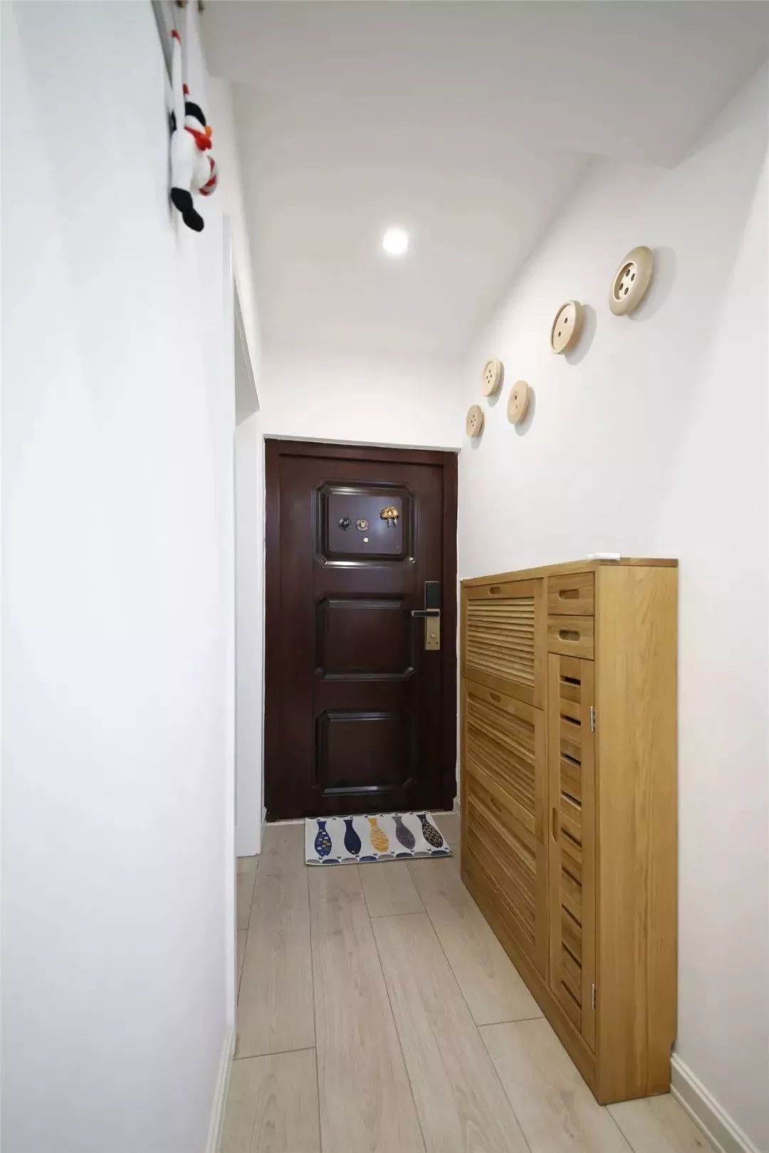 这套案例的户型是手枪型的,入户的玄关走廊比较窄,所以设计师选择了迷你的窄鞋柜,搭配上方的创意挂钩,也能满足日常的使用需求。