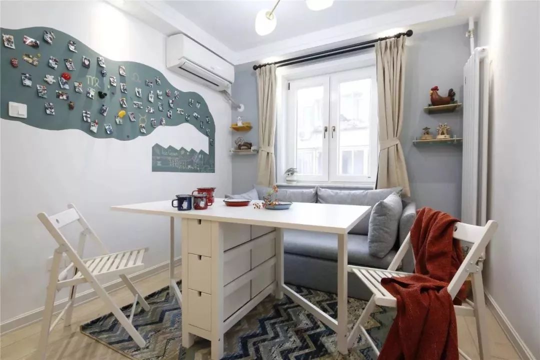隐藏在沙发边上的小柜子其实就是餐厅的餐桌,可折叠的餐桌是很适合小户型的,把客餐厅放在同一个空间也更为紧凑实用。