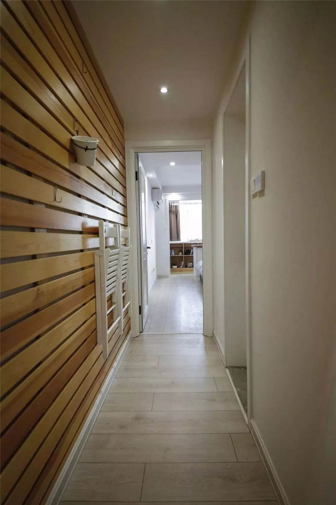 通往厨房和主卧的走廊过道,墙面做了木质造型,餐椅也被挂在了墙上,充分的利用小户型的每一个空间。