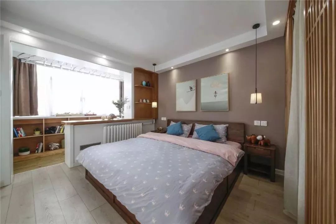 主卧室和阳台连通了起来,做个半墙作为隔断。床头背景墙刷成了棕褐色,搭配深木色的床和床头柜、素雅的床品,显得端庄而又优雅舒适。