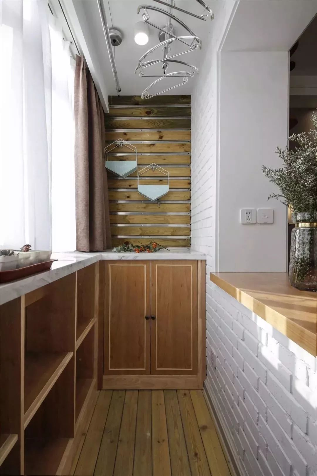 阳台的面积虽然不大,但设计师没少在收纳上花心思,靠窗的一排开放式地柜,侧方也做了储物柜,长木块搭配文化砖的设计让阳台更显自然、轻松。