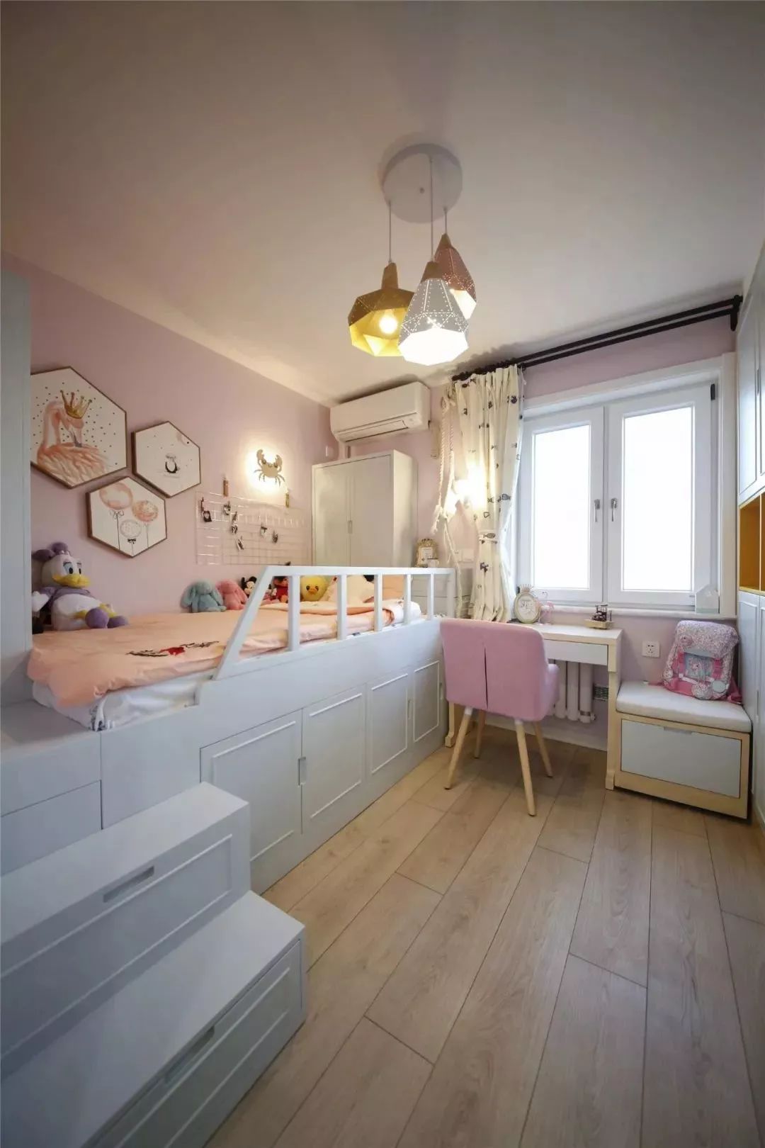 女孩房的床和书桌齐高,利用床底的空间来做收纳,另一侧也做了到顶的衣柜。粉色调的女孩房给人一种浪漫、可爱的感觉。