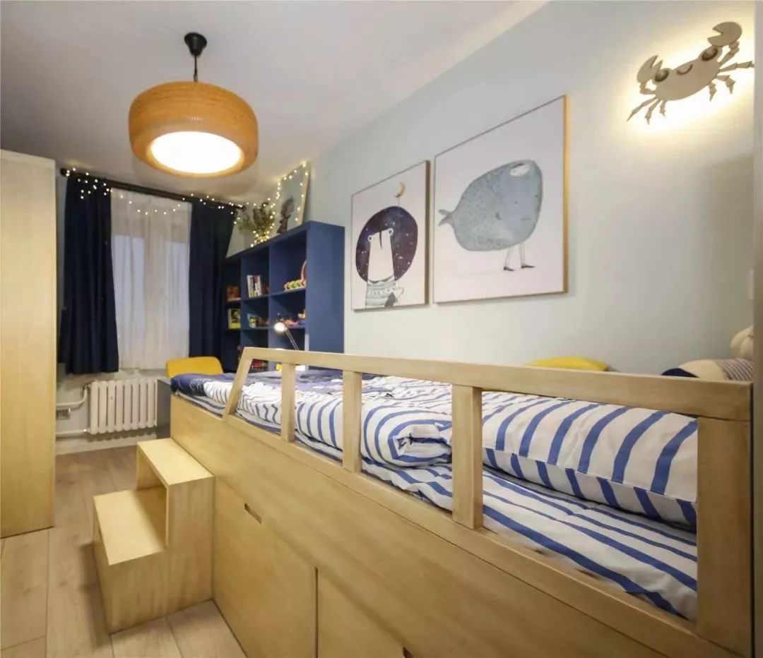 男孩房的配色就会比较简约一些,以原木风为主搭配蓝色调的设计,同样把床给抬高,底部空间被充分利用起来做收纳。