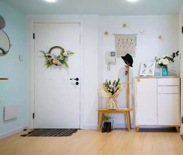 入户玄关处摆放了换鞋凳、立式衣架和成品鞋柜,侧方墙面刷成了蓝色系,搭配花环、干花等等作为装饰,显得格外的清新自然。