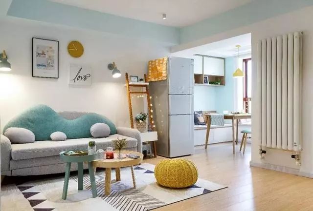 走过玄关就到了客厅空间,客厅顶部四周做了吊顶,来隐藏电线、管道,吊顶延续了玄关的蓝色系设计,搭配可爱款式的灰色沙发,非常好看。