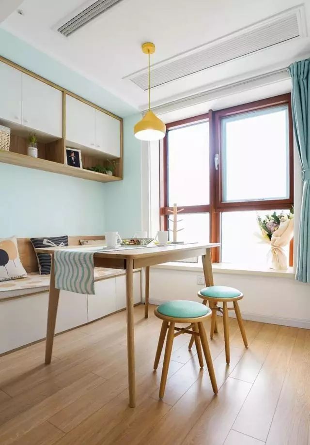 餐厅放在了靠窗的位置,卡座式餐厅设计,卡座的上方也做了吊柜,收纳空间非常充足。原木风的餐桌搭配波浪纹的桌旗,显得更加美观。